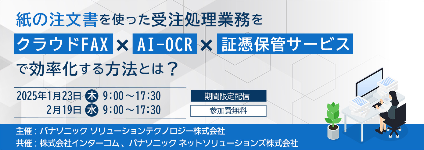| 講演内容 | 第一部:FAX電子化でこう変わる!まいと~く Cloudで始める業務改革 株式会社インターコム 第二部:注文書をAIで簡単にデータ化! 業務効率化と法対応を支援する最新AI-OCRとは パナソニック ソリューションテクノロジー株式会社 第三部:電帳法対応のMAJOR FLOWで注文書保管! 受注申請まで“つながる”ワークフロー パナソニック ネットソリューションズ株式会社 <視聴環境> Web形式のセミナーを視聴できる環境が必要です。 ・インターネットに接続できるPCをご用意ください ・専用のURLより、ブラウザーからご参加をお願いします (推奨ブラウザー:Google Chrome、Microsoft Edge) ・YouTubeを使用します |